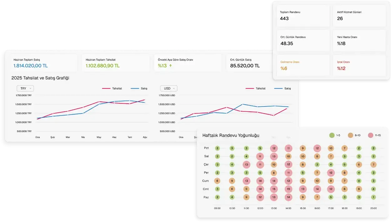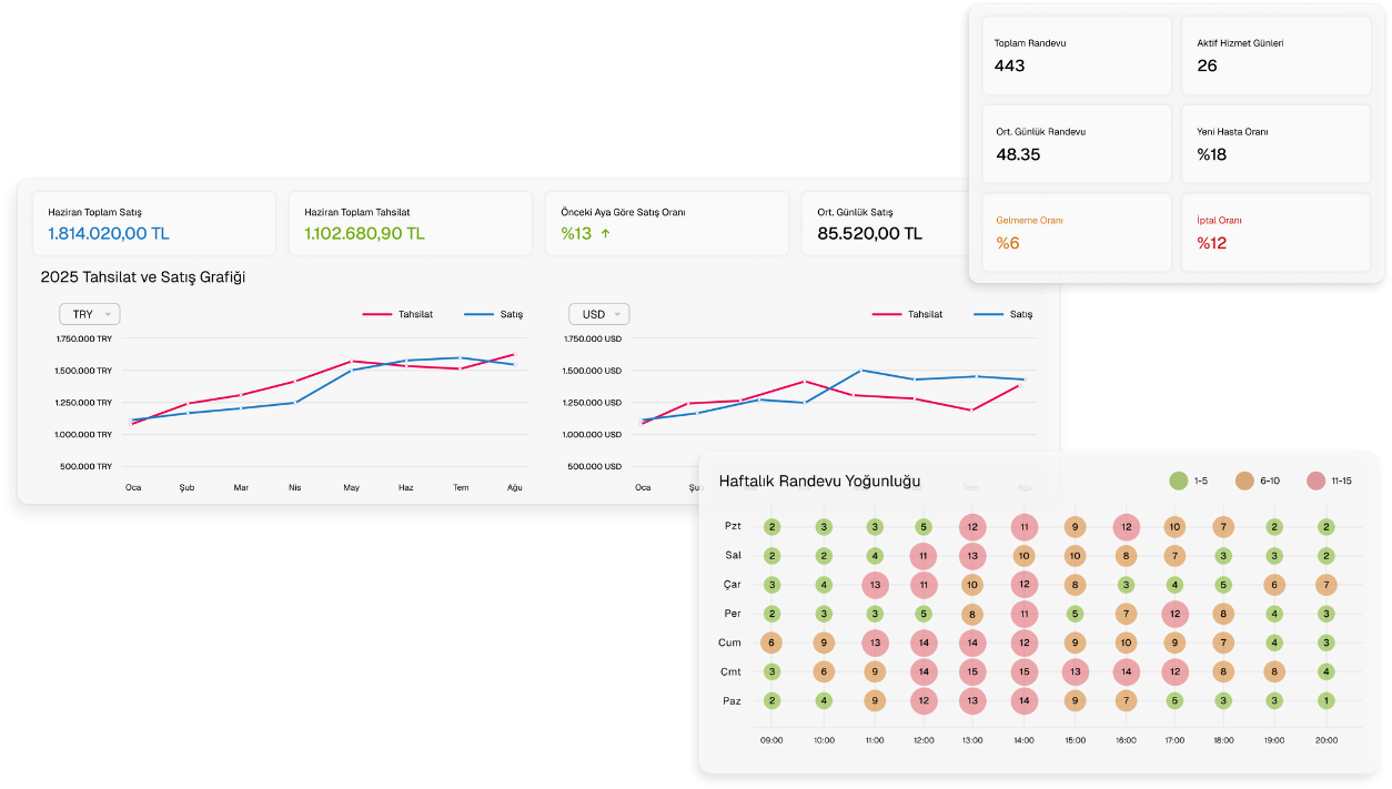 Karmaşık tablolar yerini net verilere bırakır. Holiwell; finansal, demografik ve ürün bazlı tüm operasyonu şık grafiklere dönüştürerek kliniğinizi tahminlerle değil, gerçek verilerle büyütmenizi sağlar.